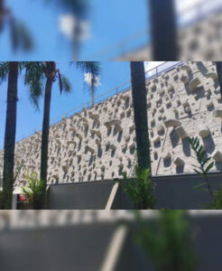 Caciporé tinha um objetivo claro: criar um painel que gerasse vibrações visuais e interiores, capaz de transmitir uma agressividade latente em cada módulo. Para isso, desenvolveu elementos modulares de concreto em sete formas diferentes, dispostos de maneira a criar uma vibração estética contínua.